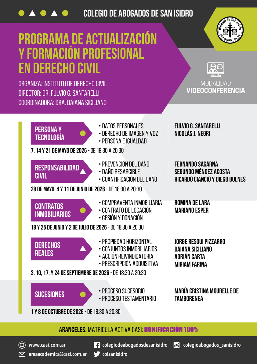 El Instituto de Derecho Civil, pondrá en marcha un Programa de Actualización y Formación Profesional en Derecho Civil, que se desarrollará entre los meses de mayo y octubre de 2026 bajo la dirección del Dr. Fulvio G. Santarelli y la coordinación de la Dra. Daiana Siciliano.