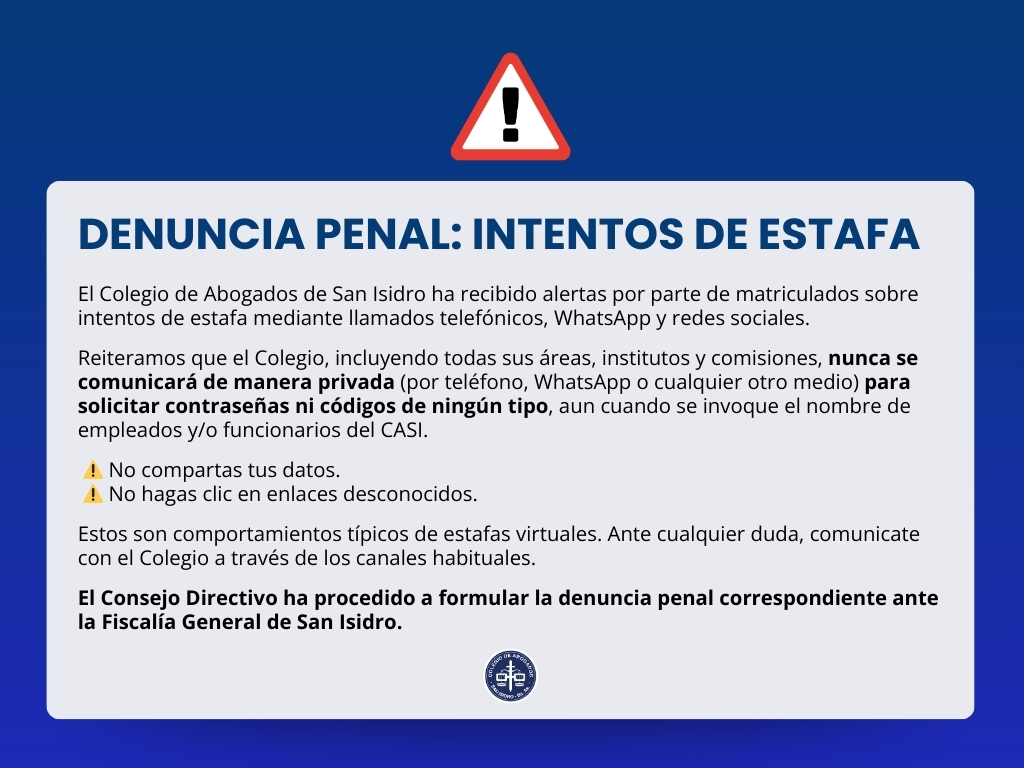 El Colegio de Abogados de San Isidro (incluyendo todas sus áreas, institutos y comisiones) nunca se comunicará de forma privada —por teléfono o por cualquier medio— para solicitar contraseñas ni códigos de ningún tipo, aun cuando se invoque el nombre de empleados y/o funcionarios publicados en la web del CASI.