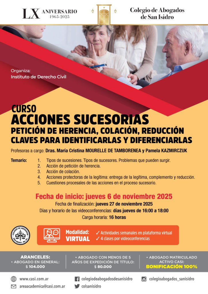El jueves 6 de noviembre comienza en dictado del curso virtual "Acciones sucesorias. Petición de herencia, colación, reducción claves para identificarlas y diferenciarlas" a cargo de las Dras. María Cristina Mourelle de Tamborenea y Pamela Kazmirczuk.