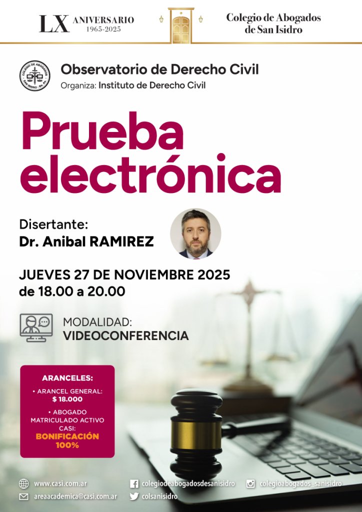 El jueves 27 de noviembre, de 18:00 a 20:00, tendrá lugar una jornada virtual organizada por el Instituto de Derecho Civil del CASI. El Dr. Anibal Ramirez disertará sobre "Prueba electrónica".