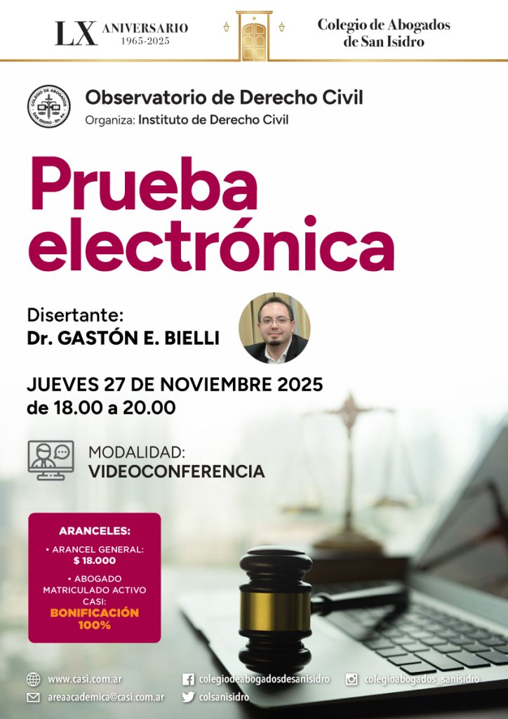 El jueves 27 de noviembre, de 18:00 a 20:00, tendrá lugar una jornada virtual organizada por el Instituto de Derecho Civil del CASI. El Dr. Gastón Bielli disertará sobre "Prueba electrónica".