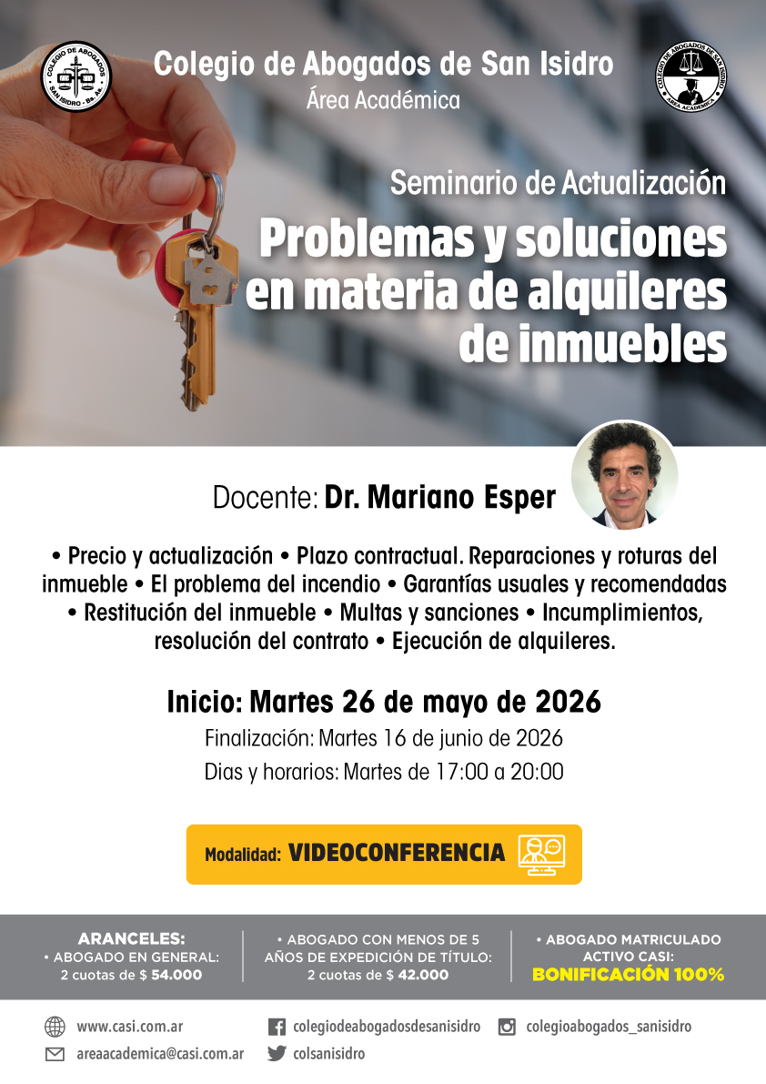 El martes 26 de mayo comienza el dictado del seminario de actualización "Problemas y soluciones en materia de alquileres de inmuebles" dictado por el Dr. Mariano Esper.