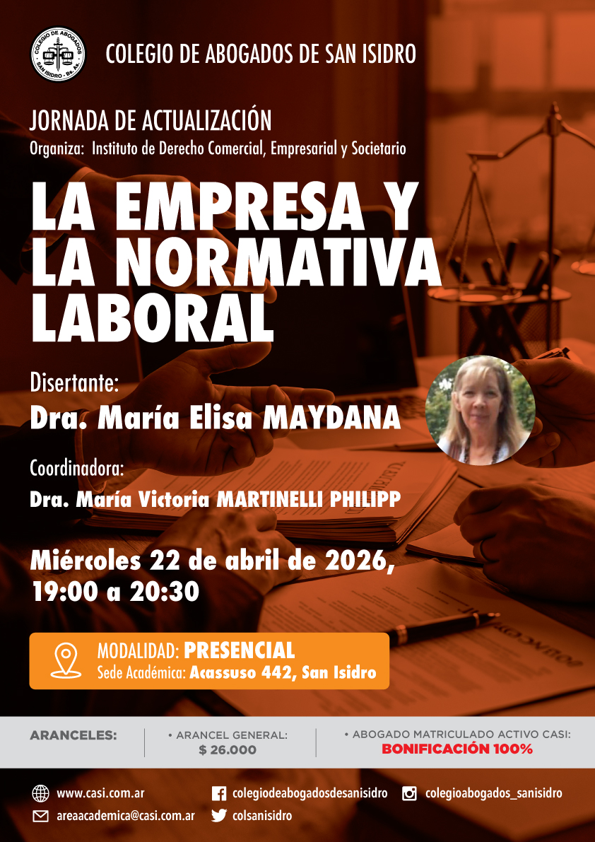 El miércoles 22 de abril, de 19:00 a 20:30, tendrá lugar una jornada de actualización presencial organizada por el Instituto de Derecho Comercial, Empresarial y Societario del CASI coordinado por la Dra. María Victoria Martinelli Philipp. La Dra. María Elisa Maydana disertará sobre "La empresa y la normativa laboral".
