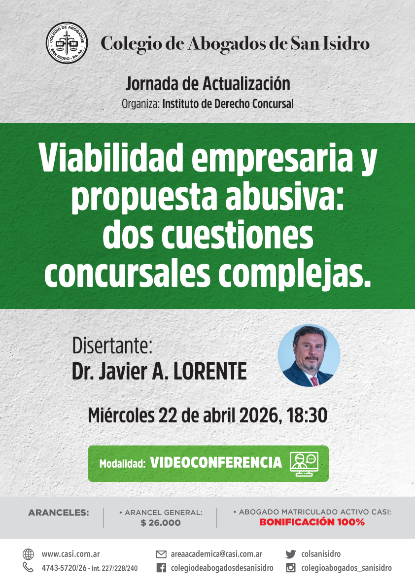 El miércoles 22 de abril, a las 18:30, tendrá lugar una jornada de actualización virtual organizada por el Instituto de Derecho Concursal del CASI. El Dr. Javier A. Lorente disertará sobre "Viabilidad empresaria y propuesta abusiva: dos cuestiones concursales complejas".