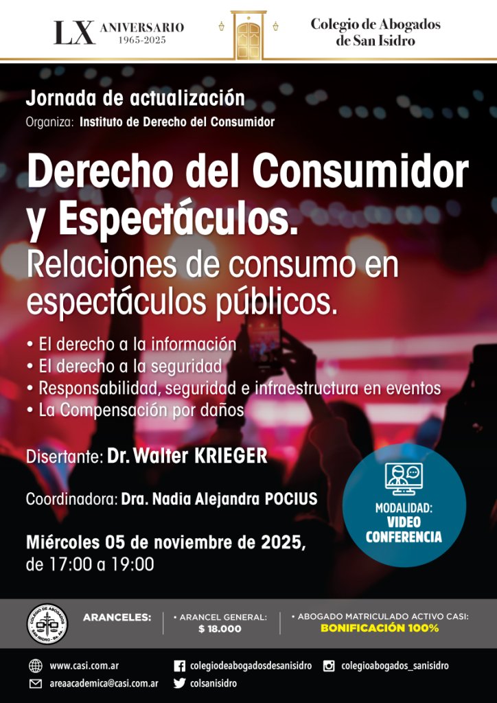 El miércoles 5 de noviembre, de 17:00 a 19:00, tendrá lugar una jornada de actualización organizada por el Instituto de Derecho del Consumidor del CASI donde el Dr. Walter Krieger disertará sobre "Derecho del consumidor y espectáculos. Relaciones de consumo en espectáculos públicos".