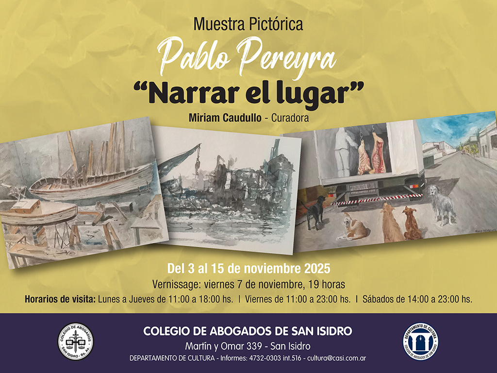 Desde el 3 al 15 de noviembre se exhibirá en el Salón de Actos de Martín y Omar 339, San Isidro, una muestra pictórica denominada “Narrar el lugar” de Pablo Pereyra. Curaduría Miriam Caudullo.
