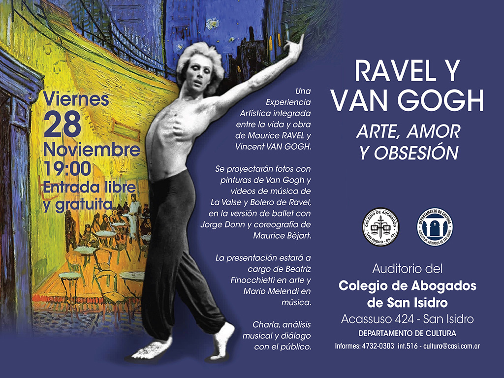 Se proyectarán fotos con pinturas de Van Gogh y videos de música de La Valse y Bolero de Ravel, en la versión de ballet con Jorge Donn y coreografía de Maurice Bejart.
