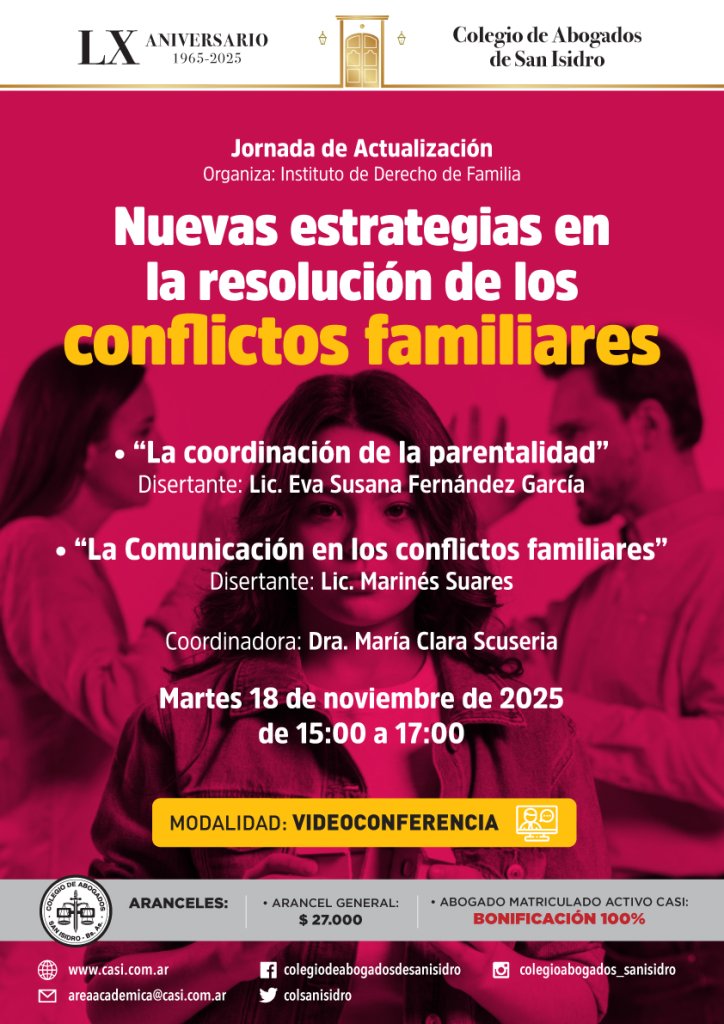 El martes 18 de noviembre, de 15:00 a 17:00, tendrá lugar una jornada de actualización virtual organizada por el Instituto de Derecho de Familia del CASI.