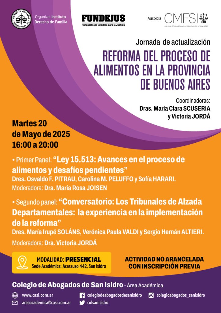 El martes 20 de mayo de 16:00 a 20:00 tendrá lugar la jornada de actualización presencial "Reforma del proceso de alimentos en la Provincia de Buenos Aires" organizada en conjunto entre el Instituto de Derecho de Familia del Colegio de Abogados de San Isidro y FUNDEJUS. Auspicia CMFSI.