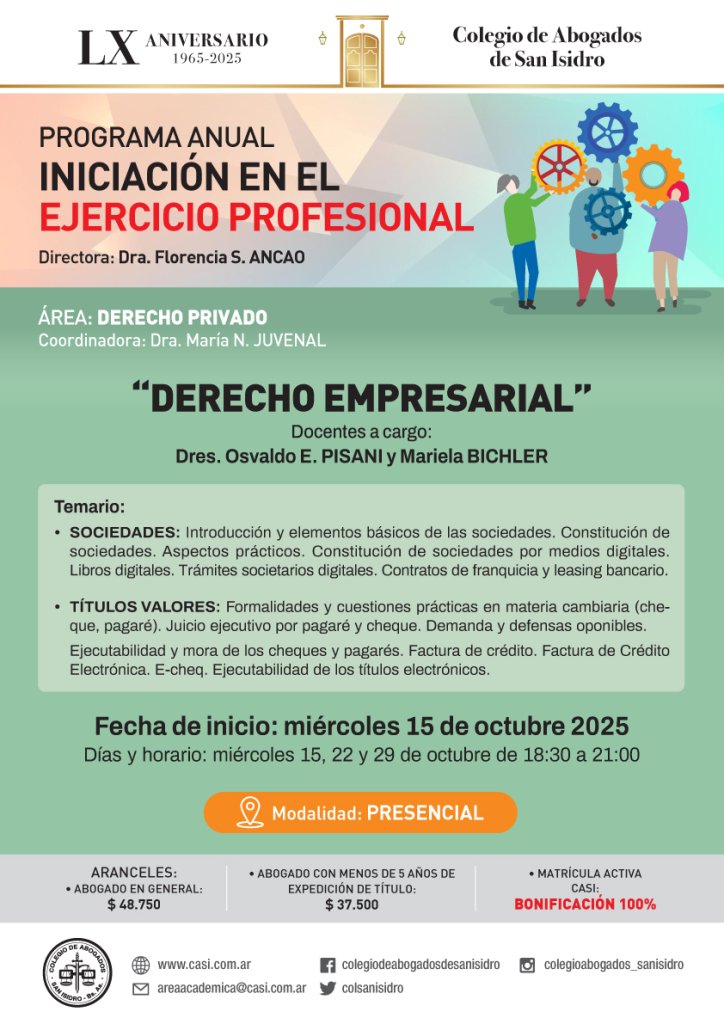 En esta oportunidad podrá inscribirse específicamente al módulo de Derecho Privado "Derecho Empresarial" que comienza el miércoles 15 de octubre. Los docentes a cargo serán los Dres. Osvaldo E. Pisani y Mariela Bichler.