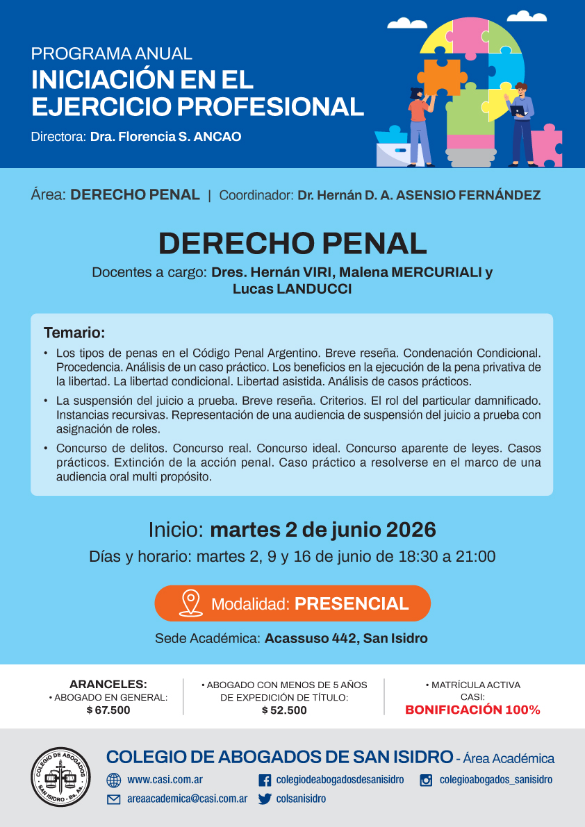 En esta oportunidad podrá inscribirse específicamente al módulo de Derecho Privado que comienza el martes 2 de junio. La modalidad de cursada es presencial. Colegas con matrícula activa del CASI cuentan con 100% de bonificación.