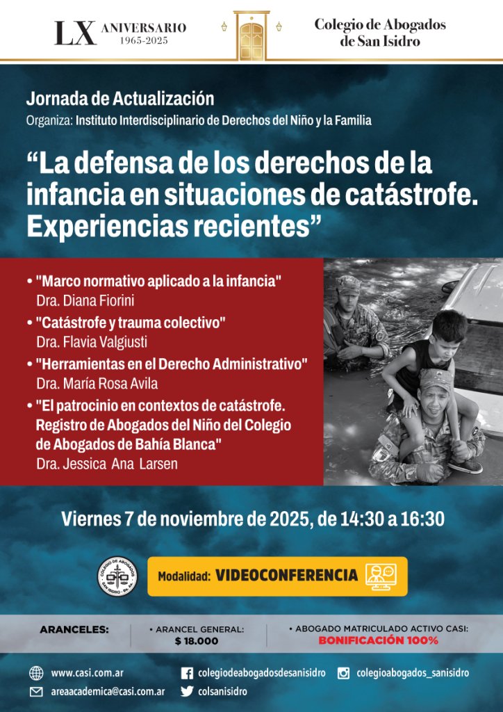 El viernes 7 de noviembre, de 14:30 a 16:30, tendrá lugar una jornada de actualización organizada por el Instituto Interdisciplinario de Derechos del Niño y la Familia "La defensa de los derechos de la infancia en situaciones de catástrofe. Experiencias recientes".