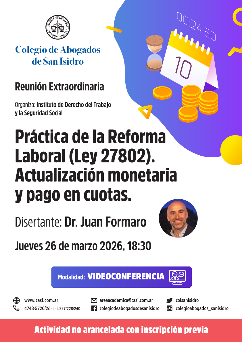 El jueves 26 de marzo, a las 18:30, tendrá lugar una reunión extraordinaria virtual organizada por el Instituto de Derecho del Trabajo y la Seguridad Social del CASI. El Dr. Juan Formaro disertará sobre "Práctica de la Reforma Laboral (Ley 27802). Actualización monetaria y pago en cuotas".