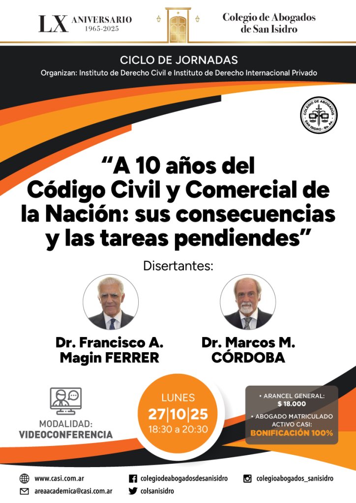 En el marco del LX aniversario del Colegio, el lunes 27 de octubre tendrá lugar la 6ta jornada virtual correspondiente al ciclo organizado por el Observatorio del Instituto de Derecho Civil del CASI "A 10 años de la vigencia del Código Civil y Comercial de la Nación".