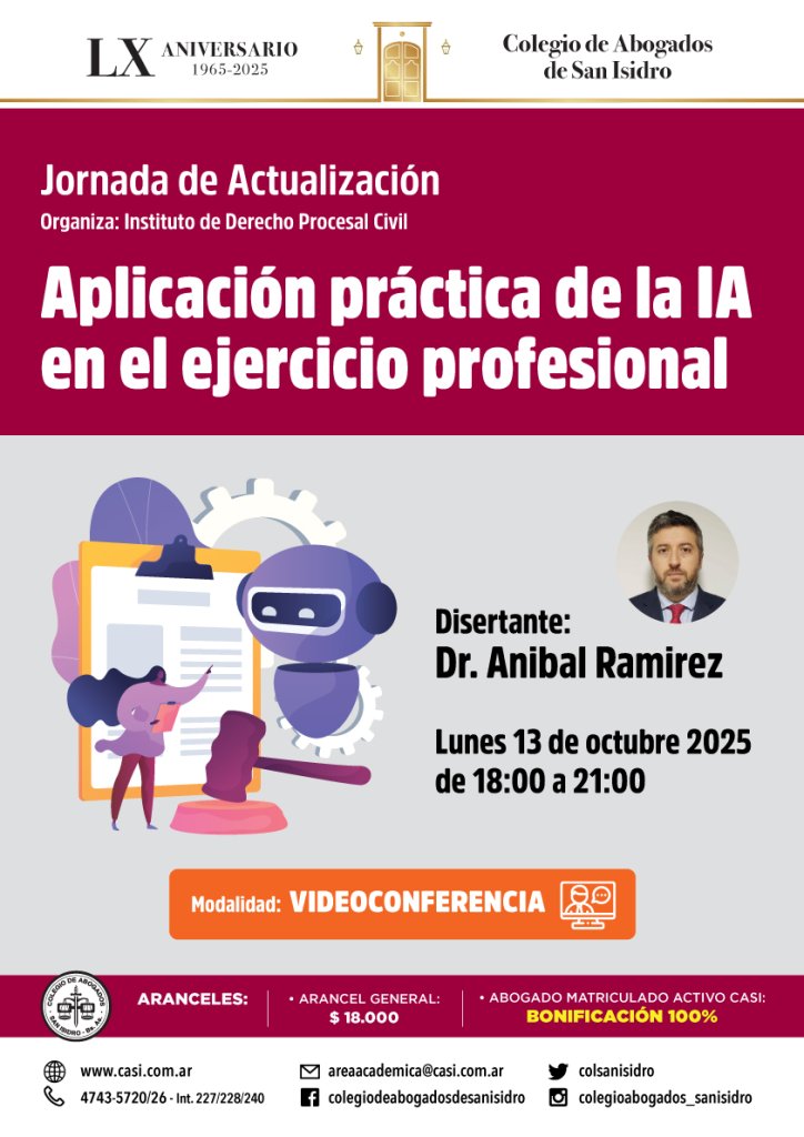 El lunes 13 de octubre, de 18:00 a 21:00, tendrá lugar una jornada de actualización virtual organizada por el Instituto de Derecho Procesal Civil del CASI. El Dr. Aníbal Ramírez disertará sobre la "Aplicación práctica de la IA en el ejercicio profesional".