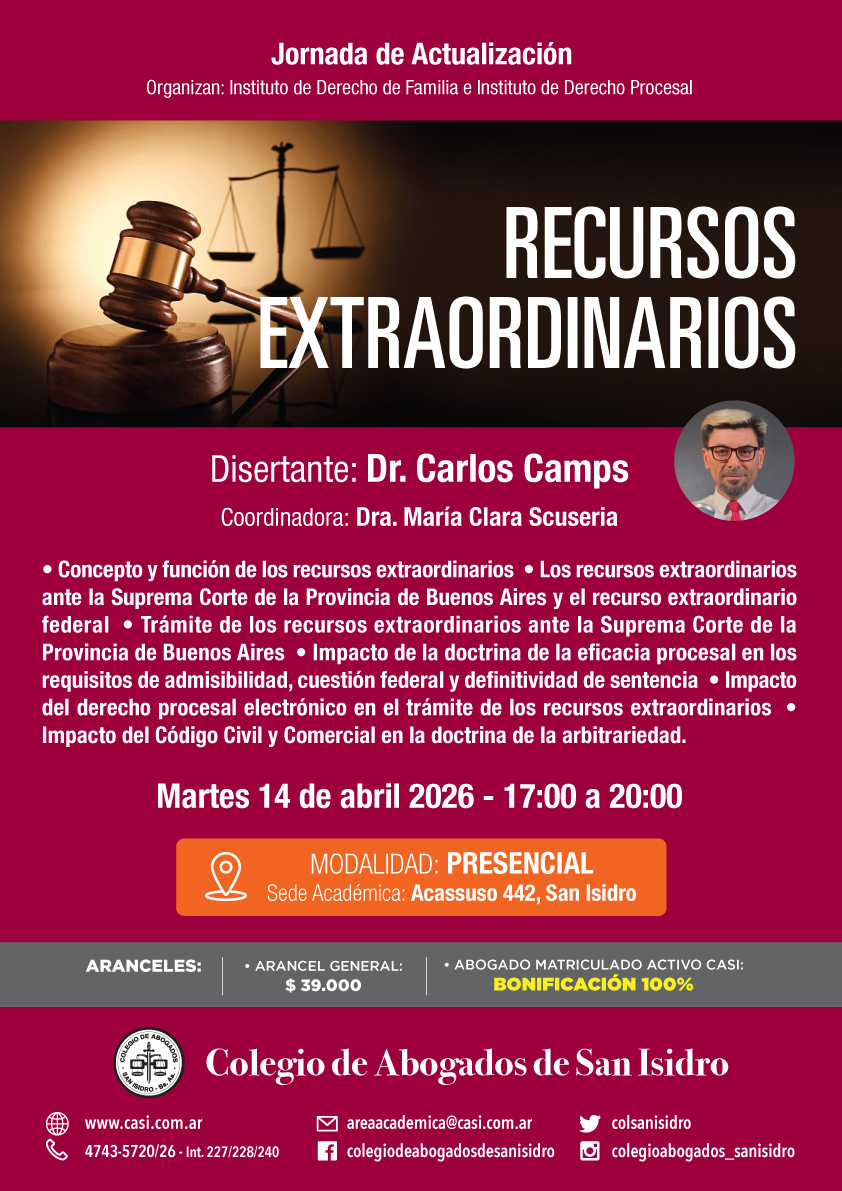 El martes 14 de abril, de 17:00 a 20:00, tendrá lugar una jornada de actualización presencial organizada por el Instituto de Familia e Instituto de Derecho Procesal del CASI. El Dr. Carlos Camps disertará sobre "Recursos extraordinarios".