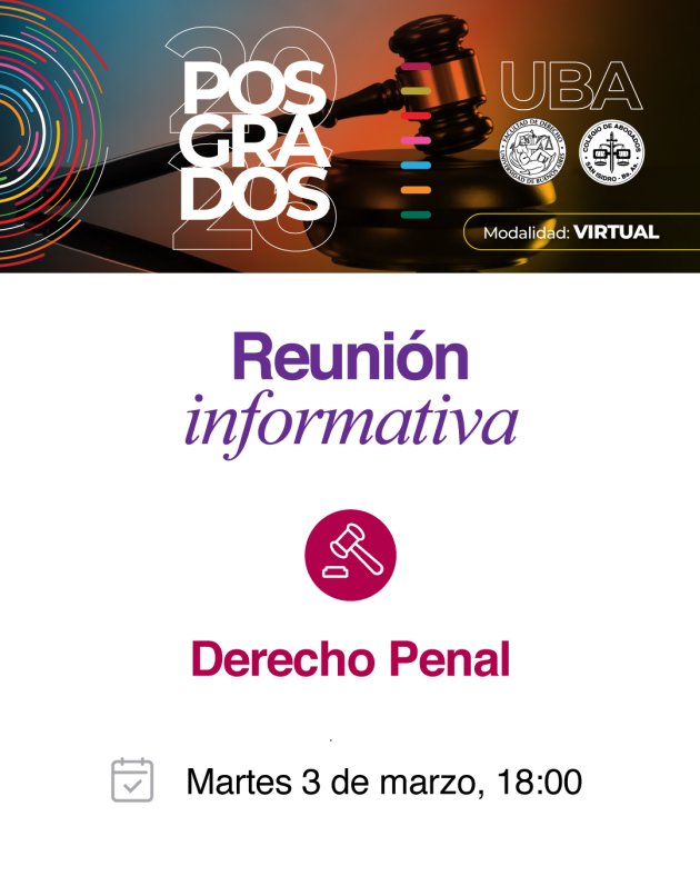 La carrera de especialización en Derecho Penal, en convenio con la Facultad de Derecho de la UBA y con inicio previsto para abril de 2026, invita a una reunión informativa destinada a quienes deseen conocer más sobre la propuesta académica que tendrá lugar de forma virtual el martes 3 de marzo a las 18:00.