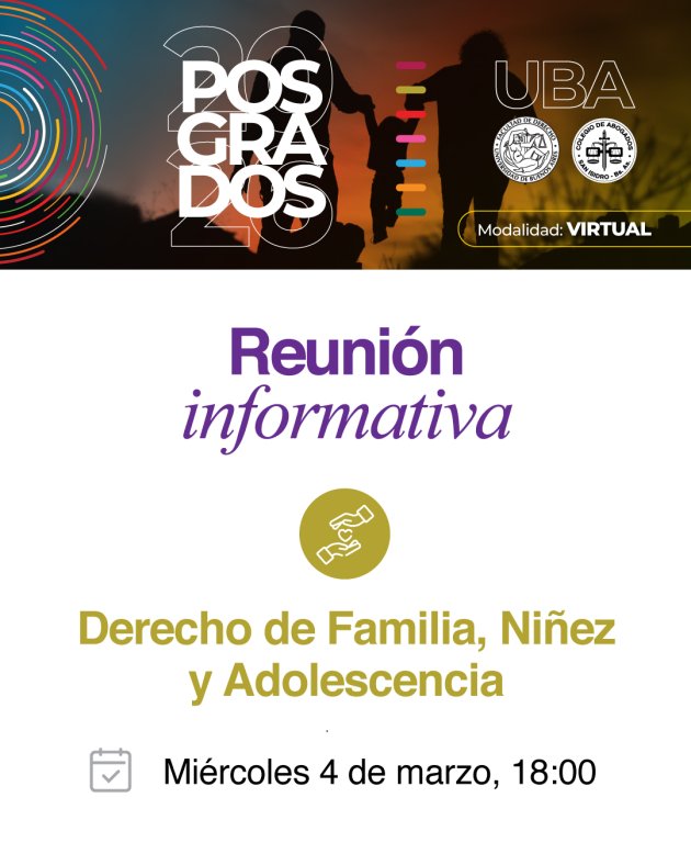 El Programa de actualización en Derecho de familia, niñez y adolescencia, en convenio con la Facultad de Derecho de la UBA y con inicio previsto para abril de 2026, invita a una reunión informativa destinada a quienes deseen conocer más sobre la propuesta académica que tendrá lugar de forma virtual el miércoles 4 de marzo a las 18:00.