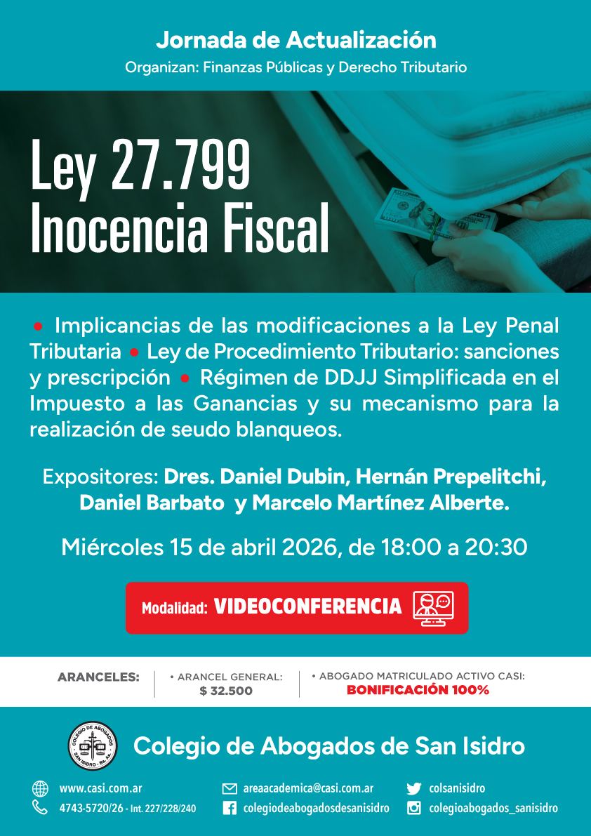 El miércoles 15 de abril, de 18:00 a 20:30, tendrá lugar una jornada de actualización virtual sobre la Ley 27799 Inocencia Fiscal.