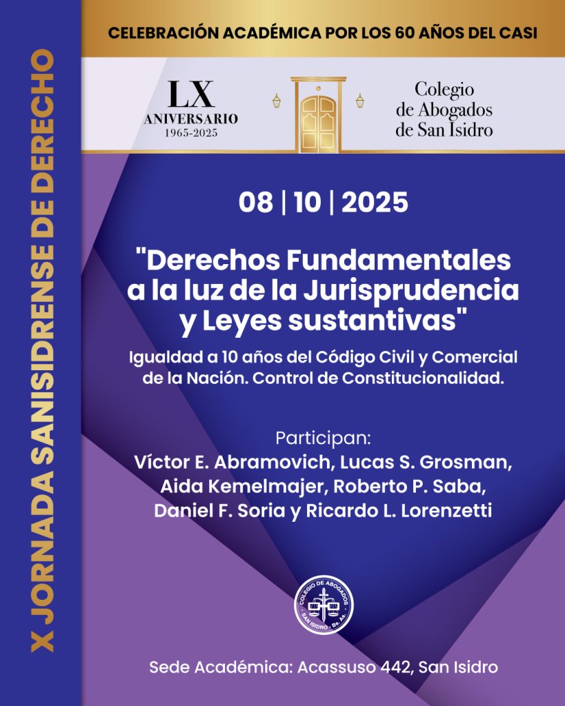En el marco de la conmemoración del 60º Aniversario del Colegio de Abogados de San Isidro, el miércoles 8 de octubre, a partir de las 14:30 tendrá lugar la X Jornada Sanisidrense de Derecho "Derechos fundamentales a la luz de la jurisprudencia y leyes sustantivas", en el auditorio de nuestra Sede Académica.