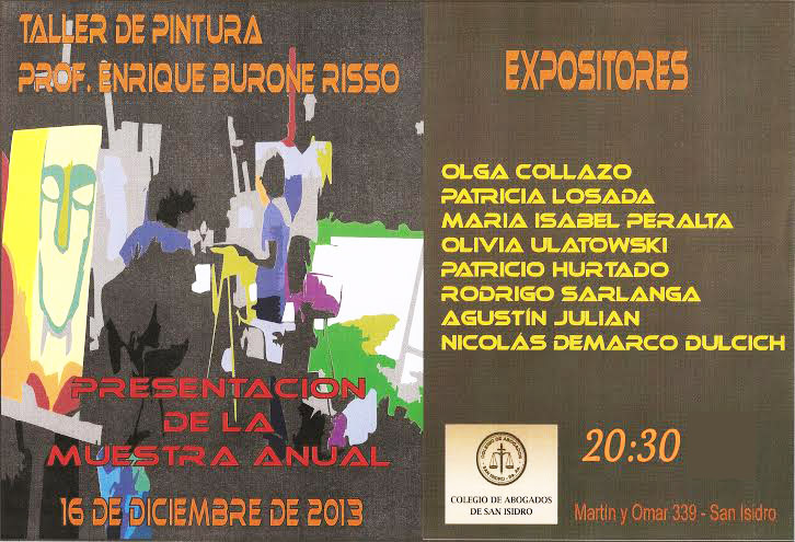 Dónde se empieza, dónde se termina. O quién sabe. Ninguna de las dos cosas. Poesías a fuerza de color. Orillas de mundos sutiles en espiral, obedeciendo a únicas cadencias trepan por los muros blancos del Salón y se plantan ante el espectador. Es un desafío del Taller de Pintura a cargo del Prof. Enrique Burone Risso, que tendrá lugar el lunes 16 de diciembre a las 20:30.